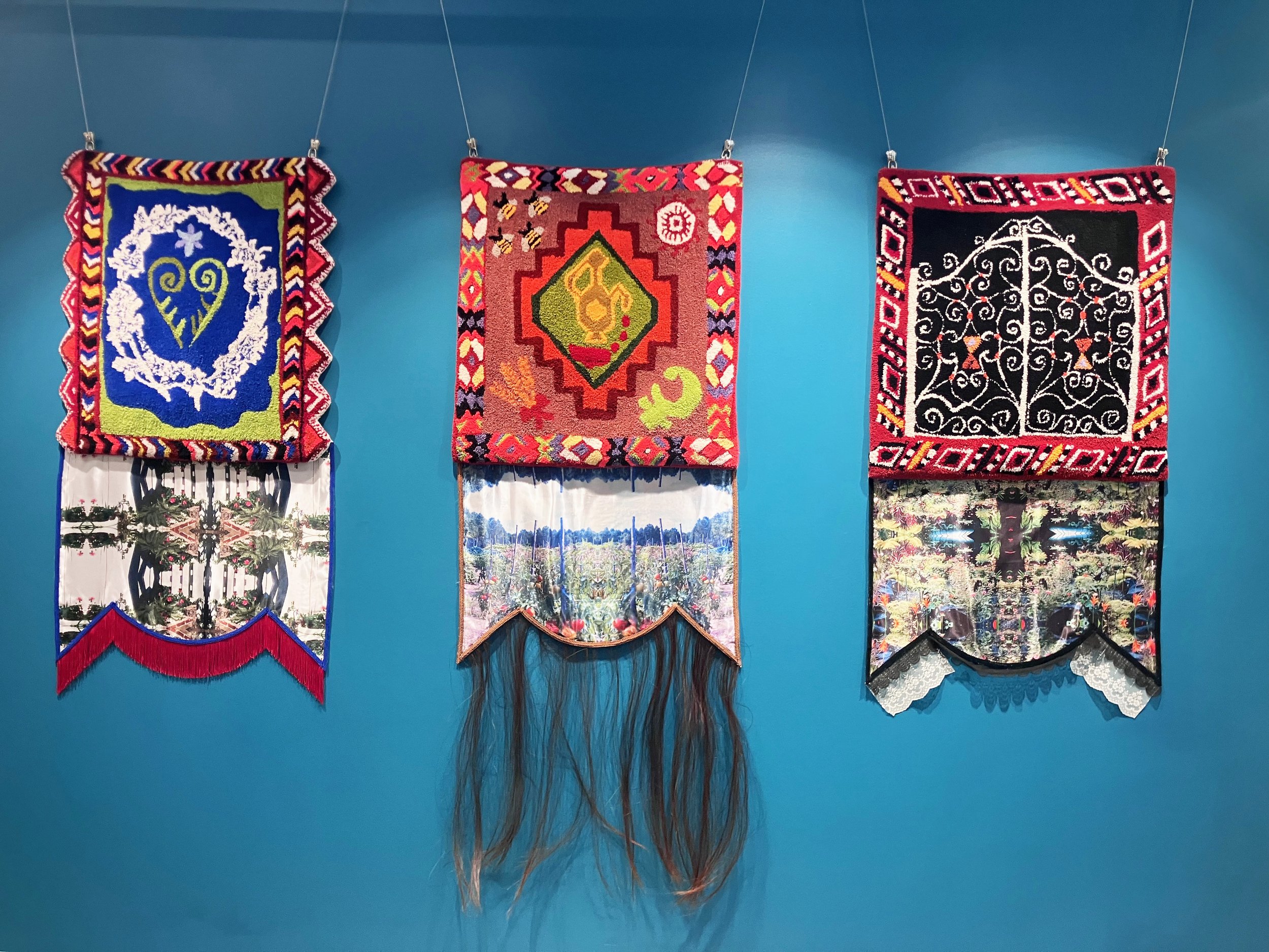 In tribute to Slavic embroidery, my tufted and satin photo banners contain protective symbols for the climate crisis, one for each station on the wheel of the year, and in tribute to the circular kolo (“wheel”) dance. They act as altars and placemarkers for our journey through the year, the wheel of the year also representing the cycle of life. Creating symbols is a bid to create our future, while also acting as a record of what the concerns of a society or community were. Many Slavic embroidery symbols still apply to our modern concerns–symbols for protection from violence, a call for health, and energetic protection. I made these rugs with aprons while in reverence to and communication with my Slavic ancestors, with a prayer in mind for each piece. One of the ways we can fight for the future of our planet and neighborhoods is keeping our ancestors present, connecting with their traditions and magic and the ways of living they left us with to continue and adapt. This includes everyday objects like textiles, clothing, furniture and food, many of which have magical and protective qualities.